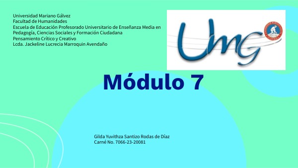 Universidad Mariano Gálvez Facultad de Humanidades Escuela de Educación Profesorado Universitario de Enseñanza Media en Pedagogía, Ciencias Sociales y Formación Ciudadana Pensamiento Crítico y Creativo Lcda. Jackeline Lucrecia Marroquin Avendaño