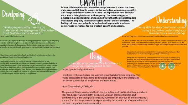 I chose this template and interactive image because it shows the three main areas which lead to success in the workplace when using empathy. This image and the resources in it show the depiction of how and why each area is being best used with empathy. The three categories developing, understanding, and using all ways that the greatest leaders incorporate empathy into the workplace and for their teammates. The feelings of your peers should be understood to promote a safe and comfortable workplace for the greatest benefit and outcome.