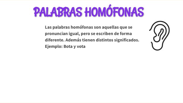 Las palabras homófonas son aquellas que se pronuncian igual, pero se escriben de forma diferente. Además tienen distintos significados. Ejemplo: Bota y vota