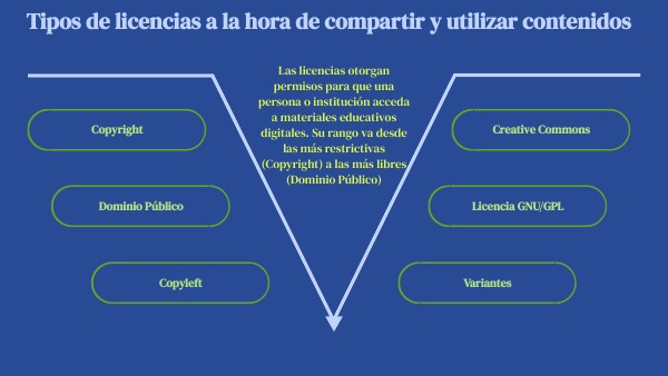 Las licencias otorgan permisos para que una persona o institución acceda a materiales educativos digitales. Su rango va desde las más restrictivas (Copyright) a las más libres (Dominio Público)