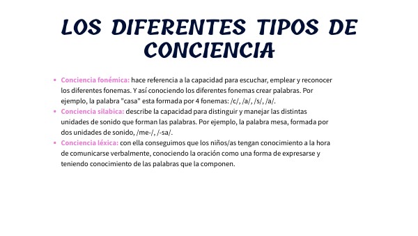 - Conciencia fonémica: hace referencia a la capacidad para escuchar, emplear y reconocer los diferentes fonemas. Y así conociendo los diferentes fonemas crear palabras. Por ejemplo, la palabra "casa" esta formada por 4 fonemas: /c/, /a/, /s/, /a/.