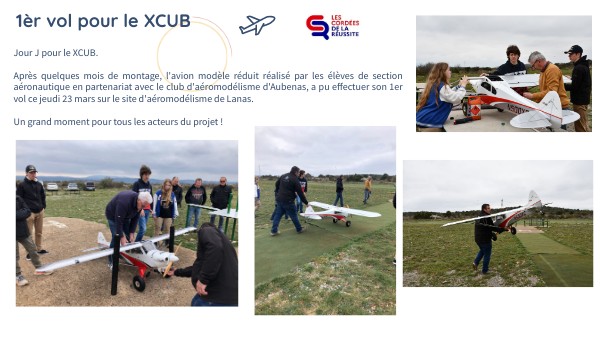 Jour J pour le XCUB. Après quelques mois de montage, l'avion modèle réduit réalisé par les élèves de section aéronautique en partenariat avec le club d'aéromodélisme d'Aubenas, a pu effectuer son 1er vol ce jeudi 23 mars sur le site d'aéromodélisme de Lanas. Un grand moment pour tous les acteurs du projet !