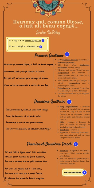 Heureux qui, comme Ulysse, a fait un beau voyage, Ou comme cestuy-là qui conquit la toison, Et puis est retourné, plein d’usage et raison, Vivre entre ses parents le reste de son âge !