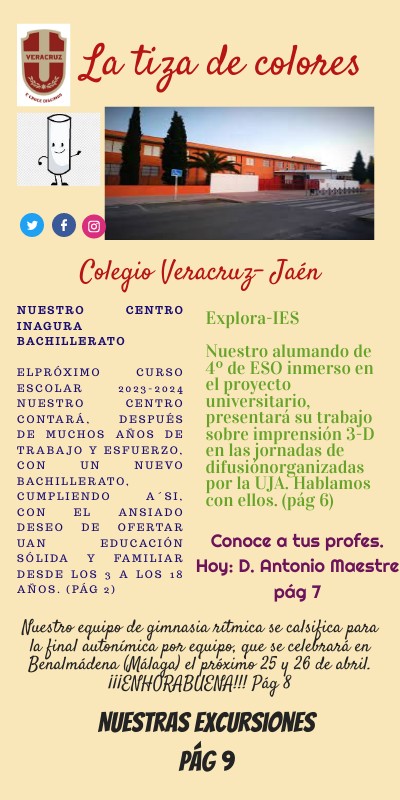 NUESTRO CENTRO INAGURA BACHILLERATO eLPRÓXIMO CURSO ESCOLAR 2023-2024 NUESTRO CENTRO CONTARÁ, DESPUÉS DE MUCHOS AÑOS DE TRABAJO Y ESFUERZO, CON UN NUEVO BACHILLERATO, CUMPLIENDO A´SI, CON EL ANSIADO DESEO DE OFERTAR UAN EDUCACIÓN SÓLIDA Y FAMILIAR DESDE LOS 3 A LOS 18 AÑOS. (pág 2)
