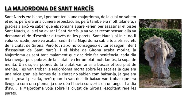 Sant Narcís era bisbe, i per tant tenía una majordoma, de la cual no sabem el nom, però era una cuinera espectacular, però també era molt tafanera, i gràcies a això va saber que els romans apareixerien per assasinar el bisbe Sant Narcís, ella el va avisar i Sant Narcís la va voler recompensar, ella va demanar el do d'escoltar a través de les parets. Sant Narcís al inici no li volia concedir, però va acabar cedint i la Majordoma sabia tots els secrets de la ciutat de Girona. Però tot i aixó no consegueix evitar el segon intent d'assasinat de Sant Narcís, i el bisbe de Girona acaba morint, la Majordoma es sent tant malament que decideix fer penitència, cada dia feia menjar pels pobres de la ciutat i va fer un plat molt famós, la sopa de menta. Un dia, els pobres de la ciutat van anar a buscar el seu plat de menjar, i es van trobar la Majordoma morta sobre les escales ja que era una mica gran, els homes de la ciutat no sabien com baixar-la, ja que era molt grosa i pesada, però quan la van decidir baixar van trobar que era lleugera com una ploma, ja que déu l'havia convertit en un ángel. I a dia d'avui, la Majordoma vola sobre la ciutat de Girona, escoltant rere les parets.