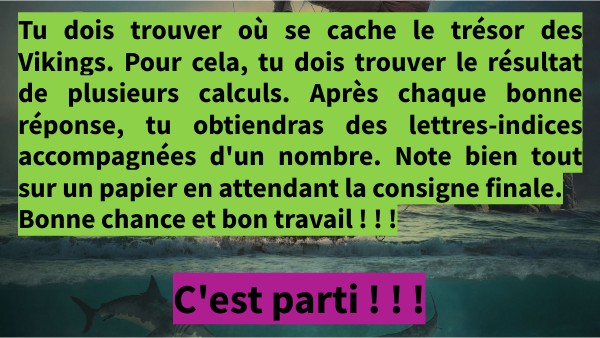 Tu dois trouver où se cache le trésor des Vikings. Pour cela, tu dois trouver le résultat de plusieurs calculs. Après chaque bonne réponse, tu obtiendras des lettres-indices accompagnées d'un nombre. Note bien tout sur un papier en attendant la consigne finale. Bonne chance et bon travail ! ! !