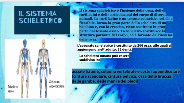 assiale (cranio, colonna vertebrale e coste) appendicolare (cintura scapolare, cintura pelvica, ossa delle braccia, delle gambe, delle mani e dei piedi)