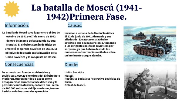 La batalla de Moscú tuvo lugar entre el dos de octubre de 1941 y el 7 de enero de 1942 dentro del marco de la Segunda Guerra Mundial. El ejército alemán de Hitler se enfrentó al ejército soviético de Stalin. El objetivo de los Nazis era la invasión de la Unión Soviética y la conquista de Moscú.