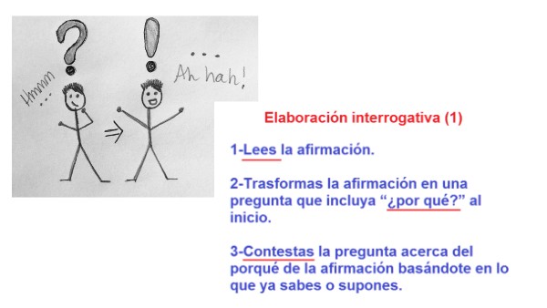 El interrogatorio elaborativo es un método específico de elaboración. Aquí, la palabra interrogación se refiere a cuestionar. Interrogatorio elaborado, significaría hacer preguntas sobre cómo es que funcionan las cosas y responder a estas preguntas (por ejemplo: ¿Qué es x? ¿Cómo funciona x? ¿Qué hizo x?, etc.)