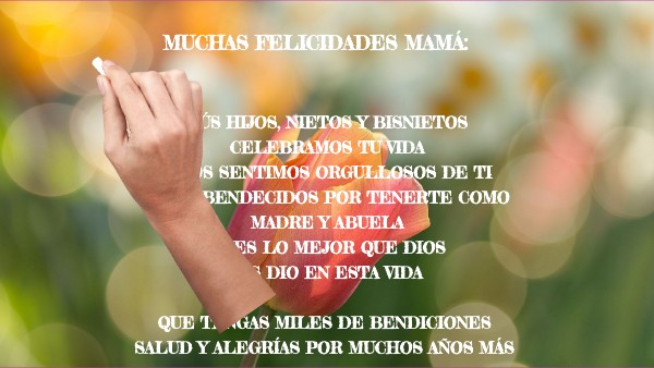 TÚS HIJOS, NIETOS Y BISNIETOS CELEBRAMOS TU VIDA Y NOS SENTIMOS ORGULLOSOS DE TI Y MUY BENDECIDOS POR TENERTE COMO MADRE Y ABUELA ERES LO MEJOR QUE DIOS NOS DIO EN ESTA VIDA QUE TENGAS MILES DE BENDICIONES SALUD Y ALEGRÍAS POR MUCHOS AÑOS MÁS