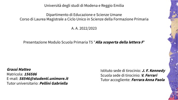 Università degli studi di Modena e Reggio Emilia Dipartimento di Educazione e Scienze Umane Corso di Laurea Magistrale a Ciclo Unico in Scienze della Formazione Primaria A. A. 2022/2023 Presentazione Modulo Scuola Primaria T5 "Alla scoperta della lettera F"