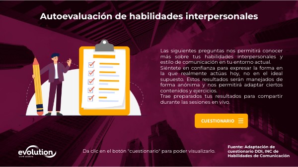 Las siguientes preguntas nos permitirá conocer más sobre tus habilidades interpersonales y estilo de comunicación en tu entorno actual.Siéntete en confianza para expresar la forma en la que realmente actúas hoy, no en el ideal supuesto. Estos resultados serán manejados de forma anónima y nos permitirá adaptar ciertos contenidos y ejercicios. Trae preparados tus resultados para compartir durante las sesiones en vivo.