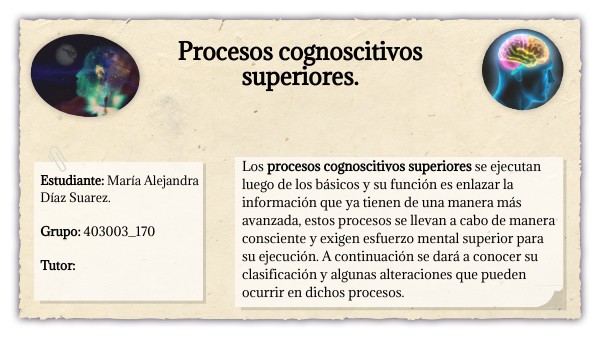 Los procesos cognoscitivos superiores se ejecutan luego de los básicos y su función es enlazar la información que ya tienen de una manera más avanzada, estos procesos se llevan a cabo de manera consciente y exigen esfuerzo mental superior para su ejecución. A continuación se dará a conocer su clasificación y algunas alteraciones que pueden ocurrir en dichos procesos.