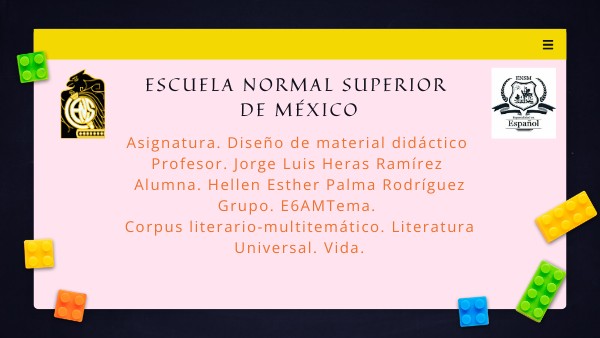 Asignatura. Diseño de material didáctico Profesor. Jorge Luis Heras Ramírez Alumna. Hellen Esther Palma Rodríguez Grupo. E6AMTema. Corpus literario-multitemático. Literatura Universal. Vida.