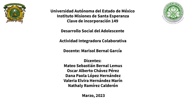 Universidad Autónoma del Estado de México Instituto Misiones de Santa Esperanza Clave de incorporación 149 Desarrollo Social del Adolescente Actividad Integradora Colaborativa Docente: Marisol Bernal García Dicentes: Mateo Sebastián Bernal Lemus Oscar Alberto Chávez Pérez Dana Paola López Hernández Valeria Elvira Hernández Marín Nathaly Ramírez Calderón Marzo, 2023