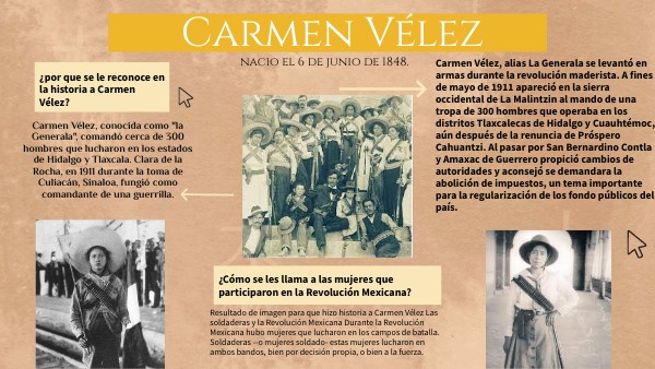 Resultado de imagen para que hizo historia a Carmen Vélez Las soldaderas y la Revolución Mexicana Durante la Revolución Mexicana hubo mujeres que lucharon en los campos de batalla. Soldaderas --o mujeres soldado- estas mujeres lucharon en ambos bandos, bien por decisión propia, o bien a la fuerza.