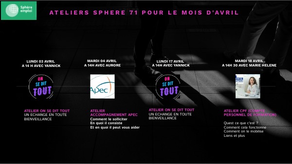 ATELIErs SPHERE 71 POUR LE MOIS D'AVRIL