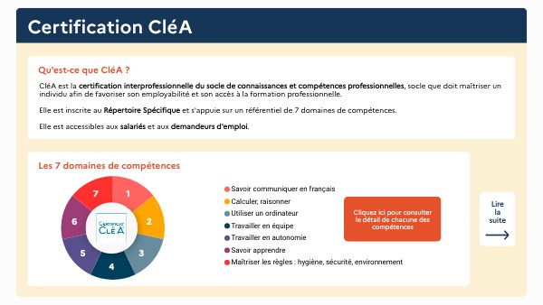 CléA est la certification interprofessionnelle du socle de connaissances et compétences professionnelles, socle que doit maîtriser un individu afin de favoriser son employabilité et son accès à la formation professionnelle. Elle est inscrite au Répertoire Spécifique et s'appuie sur un référentiel de 7 domaines de compétences. Elle est accessibles aux salariés et aux demandeurs d'emploi.