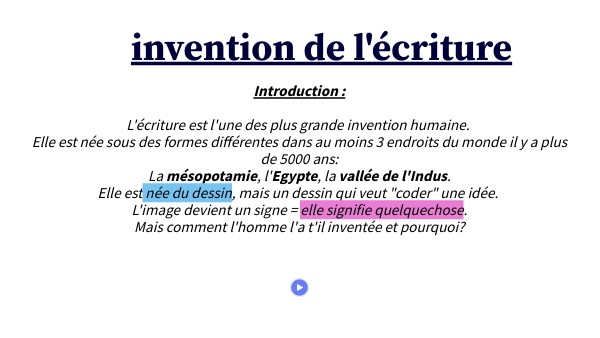 Introduction : L'écriture est l'une des plus grande invention humaine. Elle est née sous des formes différentes dans au moins 3 endroits du monde il y a plus de 5000 ans: La mésopotamie, l'Egypte, la vallée de l'Indus. Elle est née du dessin, mais un dessin qui veut "coder" une idée. L'image devient un signe = elle signifie quelquechose. Mais comment l'homme l'a t'il inventée et pourquoi?