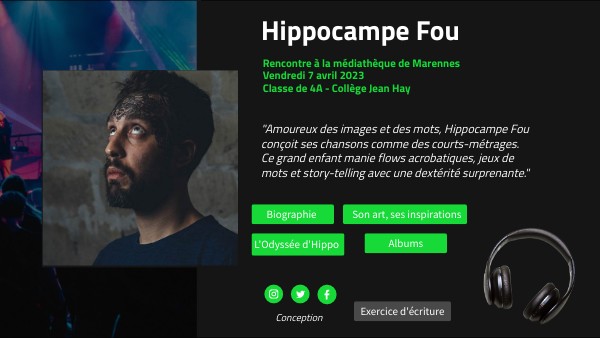 Pourquoi Hippocampe Fou ?HIPPOCAMPE parce qu’il a une manière bien à lui de rapper, un peu de manière aquatique. FOU car il est fondu du 7e art et il voit le monde comme un zoo plein d’imaginaire.