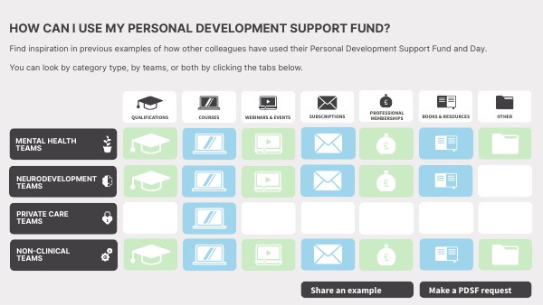 Find inspiration in previous examples of how other colleagues have used their Personal Development Support Fund and Day. You can look by category type, by teams, or both by clicking the tabs below.