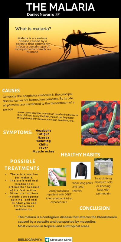 The malaria is a contagious disease that attacks the bloodstream caused by a parasite and transported by mosquitos. Most common in tropical and subtropical areas. BIBLIOGRAPHY: