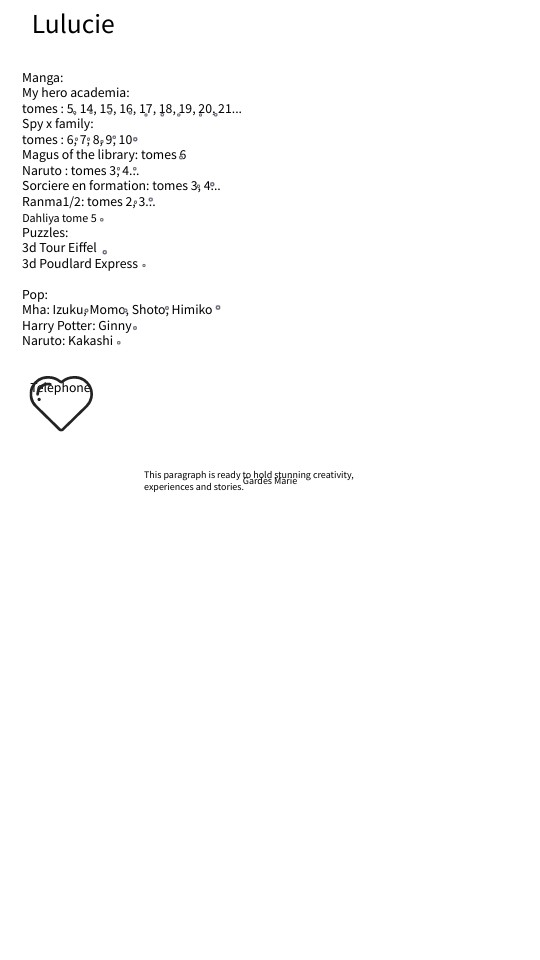 Manga:My hero academia: tomes :=, 19, 20, 21...Spy x family:tomes : 6, 7, 8, 9, 10Magus of the library: tomes 6 Naruto : tomes 3, 4... Sorciere en formation: tomes 3, 4... Ranma1/2: tomes 2, 3... Puzzles: 3d Tour Eiffel 3d Poudlard Express Pop: Mha: Izuku, Momo, Shoto, Himiko Harry Potter: Ginny Naruto: Kakashi Telephone