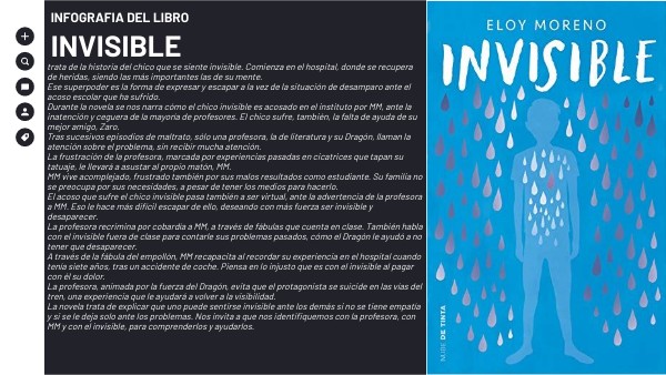 trata de la historia del chico que se siente invisible. Comienza en el hospital, donde se recupera de heridas, siendo las más importantes las de su mente. Ese superpoder es la forma de expresar y escapar a la vez de la situación de desamparo ante el acoso escolar que ha sufrido. Durante la novela se nos narra cómo el chico invisible es acosado en el instituto por MM, ante la inatención y ceguera de la mayoría de profesores. El chico sufre, también, la falta de ayuda de su mejor amigo, Zaro. Tras sucesivos episodios de maltrato, sólo una profesora, la de literatura y su Dragón, llaman la atención sobre el problema, sin recibir mucha atención. La frustración de la profesora, marcada por experiencias pasadas en cicatrices que tapan su tatuaje, le llevará a asustar al propio matón, MM. MM vive acomplejado, frustrado también por sus malos resultados como estudiante. Su familia no se preocupa por sus necesidades, a pesar de tener los medios para hacerlo. El acoso que sufre el chico invisible pasa también a ser virtual, ante la advertencia de la profesora a MM. Eso le hace más difícil escapar de ello, deseando con más fuerza ser invisible y desaparecer. La profesora recrimina por cobardía a MM, a través de fábulas que cuenta en clase. También habla con el invisible fuera de clase para contarle sus problemas pasados, cómo el Dragón le ayudó a no tener que desaparecer. A través de la fábula del empollón, MM recapacita al recordar su experiencia en el hospital cuando tenía siete años, tras un accidente de coche. Piensa en lo injusto que es con el invisible al pagar con él su dolor. La profesora, animada por la fuerza del Dragón, evita que el protagonista se suicide en las vías del tren, una experiencia que le ayudará a volver a la visibilidad. La novela trata de explicar que uno puede sentirse invisible ante los demás si no se tiene empatía y si se le deja solo ante los problemas. Nos invita a que nos identifiquemos con la profesora, con MM y con el invisible, para comprenderlos y ayudarlos.