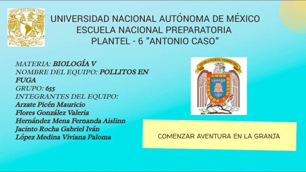 MATERIA: BIOLOGÍA V NOMBRE DEL EQUIPO: POLLITOS EN FUGA GRUPO: 655 INTEGRANTES DEL EQUIPO: Arzate Picén Mauricio Flores González Valeria Hernández Mena Fernanda Aislinn Jacinto Rocha Gabriel Iván López Medina Viviana Paloma
