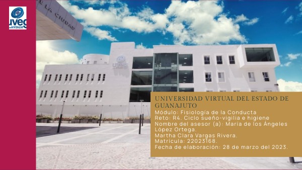 Módulo: Fisiología de la Conducta Reto: R4. Ciclo sueño-vigilia e higiene Nombre del asesor (a): María de los Ángeles López Ortega. Martha Clara Vargas Rivera. Matrícula: 22023168. Fecha de elaboración: 28 de marzo del 2023.