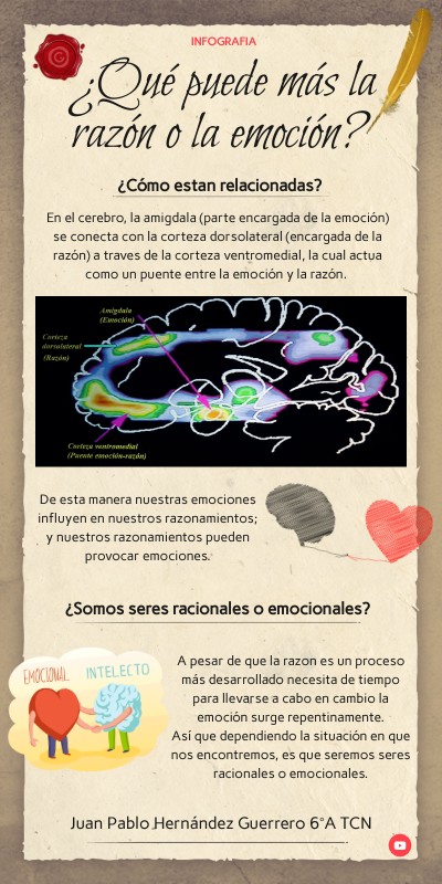 En el cerebro, la amigdala (parte encargada de la emoción) se conecta con la corteza dorsolateral (encargada de la razón) a traves de la corteza ventromedial, la cual actua como un puente entre la emoción y la razón.