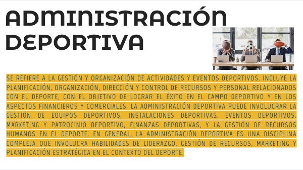 se refiere a la gestión y organización de actividades y eventos deportivos. Incluye la planificación, organización, dirección y control de recursos y personal relacionados con el deporte, con el objetivo de lograr el éxito en el campo deportivo y en los aspectos financieros y comerciales. La administración deportiva puede involucrar la gestión de equipos deportivos, instalaciones deportivas, eventos deportivos, marketing y patrocinio deportivo, finanzas deportivas, y la gestión de recursos humanos en el deporte. En general, la administración deportiva es una disciplina compleja que involucra habilidades de liderazgo, gestión de recursos, marketing y planificación estratégica en el contexto del deporte.