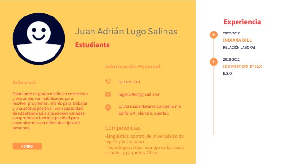 Estudiante de grado medio en confección y patronaje, con habilidades para resolver problemas, interés para trabajar y una actitud positiva . Gran capacidad de adaptabilidad a situaciones variadas, compromiso y fuerte capacidad para comunicarme con diferentes tipos de personas.