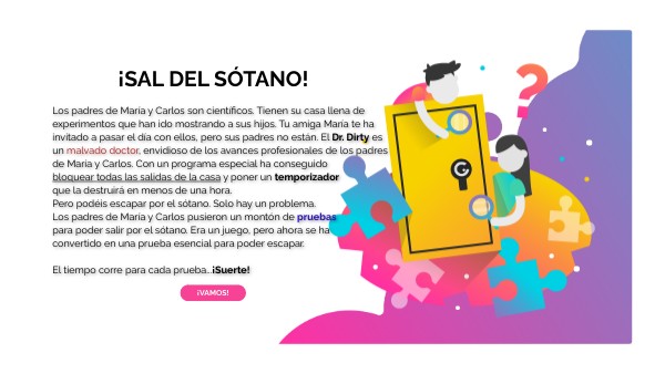 Los padres de María y Carlos son científicos. Tienen su casa llena de experimentos que han ido mostrando a sus hijos. Tu amiga María te ha invitado a pasar el día con ellos, pero sus padres no están. El Dr. Dirty es un malvado doctor, envidioso de los avances profesionales de los padres de María y Carlos. Con un programa especial ha conseguido bloquear todas las salidas de la casa y poner un temporizador que la destruirá en menos de una hora.Pero podéis escapar por el sótano. Solo hay un problema. Los padres de María y Carlos pusieron un montón de pruebas para poder salir por el sótano. Era un juego, pero ahora se ha convertido en una prueba esencial para poder escapar. El tiempo corre para cada prueba...¡Suerte!