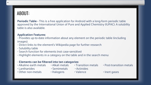 Periodic Table - This is a free application for Android with a long-form periodic table approved by the International Union of Pure and Applied Chemistry (IUPAC). A solubility table is also available. Application Features: - Provides up-to-date information about any element on the periodic table (including images). - Direct links to the element's Wikipedia page for further research - Solubility table - Search function for elements (not case-sensitive) - Highlight elements in a category on the table and in the search menu: - Elements can be filtered into ten categories: • Alkaline earth metals • Alkali metals • Transition metals • Post-transition metals • Lanthanides • Semimetals • Actinides • Other non-metals • Halogens • Valence • Inert gases