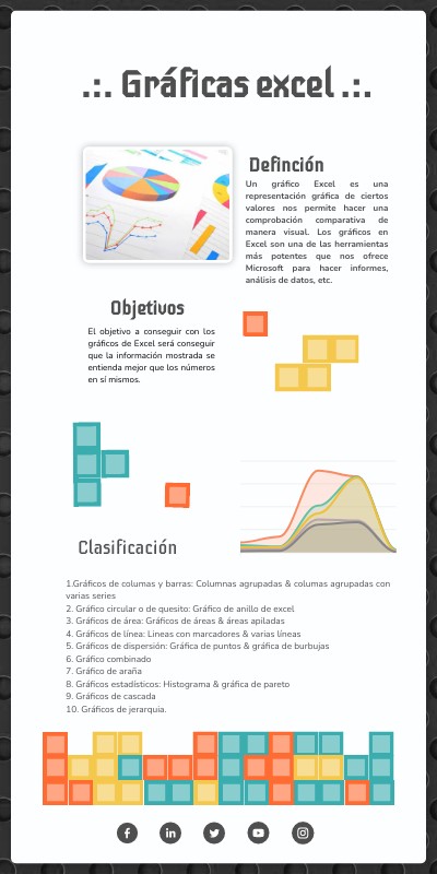 1.Gráficos de columas y barras: Columnas agrupadas & columas agrupadas con varias series 2. Gráfico circular o de quesito: Gráfico de anillo de excel 3. Gráficos de área: Gráficos de áreas & áreas apiladas 4. Gráficos de línea: Lineas con marcadores & varias líneas 5. Gráficos de dispersión: Gráfica de puntos & gráfica de burbujas 6. Gráfico combinado 7. Gráfico de araña 8. Gráficos estadísticos: Histograma & gráfica de pareto 9. Gráficos de cascada 10. Gráficos de jerarquia.