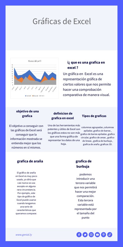 columnas agrupadas ,columnas apiladas ,grafico de barras , grafico de barras apiladas ,grafico circular, grafico de areas , grafico de lineas , grafica de burbuja , grafica de araña ,graficas 3D.
