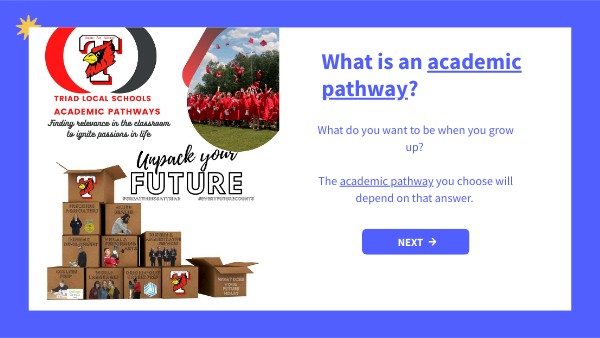 You will now enter a virtual building. Each room in the building represents a different academic pathway. Take a look at careers aligned with that pathway and its graduation cord.