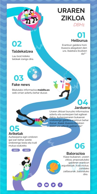 Uraren zikloari buruzko informazioa aztertu eta aurkezpen bat egitean datza. Aurkezpenaren bukaeran ondorengo galdera erantzun behar duzue: Ibaiek itsasora botatzen duten ura alferrik galtzen da?