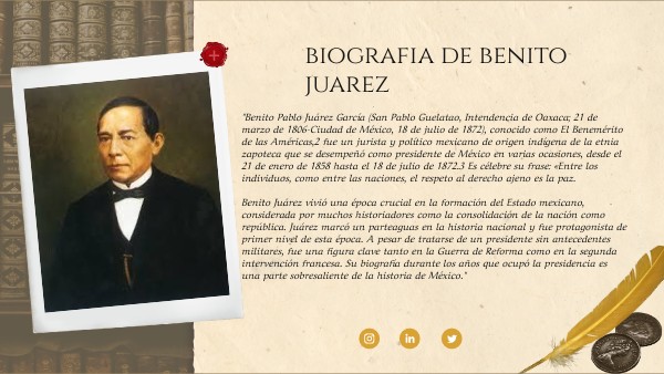 "Benito Pablo Juárez García (San Pablo Guelatao, Intendencia de Oaxaca; 21 de marzo de 1806-Ciudad de México, 18 de julio de 1872), conocido como El Benemérito de las Américas,2 fue un jurista y político mexicano de origen indígena de la etnia zapoteca que se desempeñó como presidente de México en varias ocasiones, desde el 21 de enero de 1858 hasta el 18 de julio de 1872.3 Es célebre su frase: «Entre los individuos, como entre las naciones, el respeto al derecho ajeno es la paz. Benito Juárez vivió una época crucial en la formación del Estado mexicano, considerada por muchos historiadores como la consolidación de la nación como república. Juárez marcó un parteaguas en la historia nacional y fue protagonista de primer nivel de esta época. A pesar de tratarse de un presidente sin antecedentes militares, fue una figura clave tanto en la Guerra de Reforma como en la segunda intervención francesa. Su biografía durante los años que ocupó la presidencia es una parte sobresaliente de la historia de México."