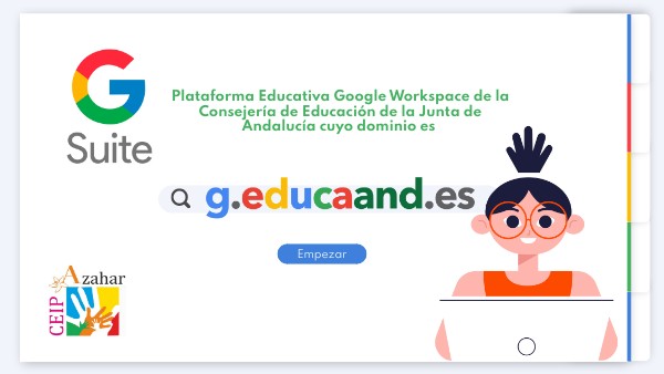 Google Suite para educación (GSuite for Education) es un servicio de Google para instituciones educativas que permite que sus usuarios cuenten con una dirección de correo electrónico y un conjunto de servicios digitales asociados a ella. La Consejería de Educación y Deporte de la Junta de Andalucía firmó el pasado año un convenio de colaboración para que los centros educativos andaluces pudieran usarlo bajo un mismo dominio g.educaand.es