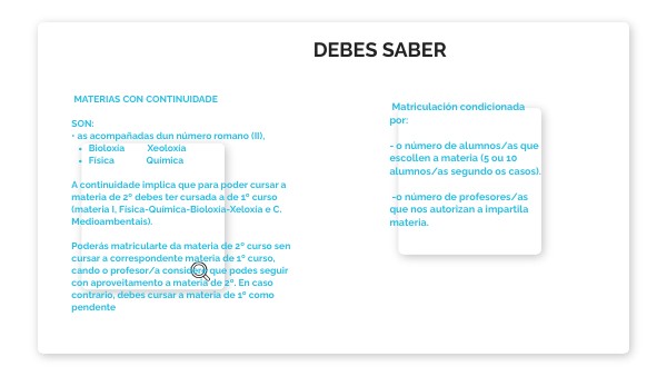 A continuidade implica que para poder cursar a materia de 2º debes ter cursada a de 1º curso (materia I, Física-Química-Bioloxía-Xeloxía e C. Medioambentais). Poderás matricularte da materia de 2º curso sen cursar a correspondente materia de 1º curso, cando o profesor/a considere que podes seguir con aproveitamento a materia de 2º. En caso contrario, debes cursar a materia de 1º como pendenteMatriculación condicionada por: - o número de alumnos/as que escollen a materia (5 ou 10 alumnos/as segundo os casos). -o número de profesores/as que nos autorizan a impartila materia.
