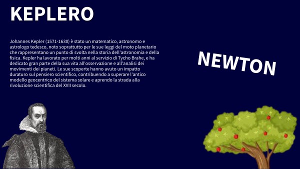 Johannes Kepler (1571-1630) è stato un matematico, astronomo e astrologo tedesco, noto soprattutto per le sue leggi del moto planetario che rappresentano un punto di svolta nella storia dell'astronomia e della fisica. Kepler ha lavorato per molti anni al servizio di Tycho Brahe, e ha dedicato gran parte della sua vita all'osservazione e all'analisi dei movimenti dei pianeti. Le sue scoperte hanno avuto un impatto duraturo sul pensiero scientifico, contribuendo a superare l'antico modello geocentrico del sistema solare e aprendo la strada alla rivoluzione scientifica del XVII secolo.