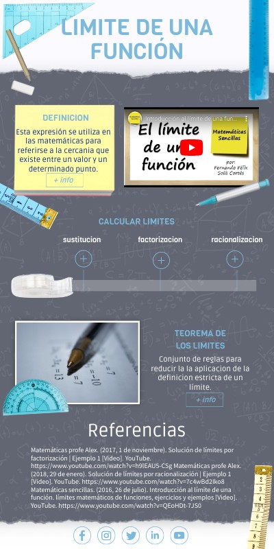 Matemáticas profe Alex. (2017, 1 de noviembre). Solución de límites por factorización | Ejemplo 1 [Video]. YouTube. https://www.youtube.com/watch?v=h9lEAU5-CSg Matemáticas profe Alex. (2018, 29 de enero). Solución de límites por racionalización | Ejemplo 1 [Video]. YouTube. https://www.youtube.com/watch?v=7c4wBd2Iko8 Matemáticas sencillas. (2016, 26 de julio). Introducción al límite de una función. límites matemáticos de funciones, ejercicios y ejemplos [Video]. YouTube. https://www.youtube.com/watch?v=QEoHDt-7JS0