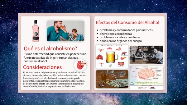 El alcohol puede originar serios problemas de salud, incluso cirrosis, demencia y destrucción de los músculos del corazón (cardiomipatía).Los alcohólicos tienen mayor riesgo de accidentes, especialmente cuando estánebrios (borrachos). El alcoholismo afecta seriamente la relación del alcohólico con sufamilia, limita las aspiraciones profesionales