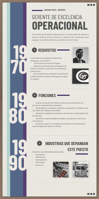 Licenciatura en Ingeniería Industrial, Sistemas o carrera afín.• Certificación en Lean Six Sigma. • Experiencia en liderazgo de equipos de mejora continua y proyectos de excelencia operacional. • Conocimientos en sistemas de gestión de calidad, análisis de datos, liderazgo y trabajo en equipo.