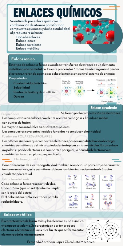 Se entiende por enlace químico a la combinación de átomos para formar compuestos químicos y darle estabilidad al producto resultante.
