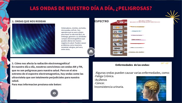 3. Cómo nos afecta la radiación electromagnética? En nuestro día a día, nosotros convivimos con ondas AM y FM, que no son peligrosas para nuestra salud. Pero en el otro extremo de el espectro electromagnetico, hay ondas como las ultravioleta que son totalmente perjudiciales para nuestra salud. Para mas informacion presiona este boton: