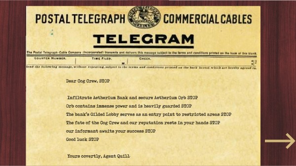 Dear Cog Crew, STOP Infiltrate Aetherium Bank and secure Aetherium Orb STOP Orb contains immense power and is heavily guarded STOP The bank's Gilded Lobby serves as an entry point to restricted areas STOP The fate of the Cog Crew and our reputation rests in your hands STOP our informant awaits your success STOP Good luck STOP Yours covertly, Agent Quill