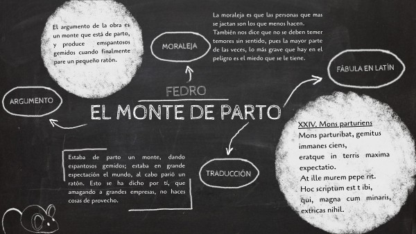 El argumento de la obra es un monte que está de parto, y produce emspantosos gemidos cuando finalmente pare un pequeño ratón.